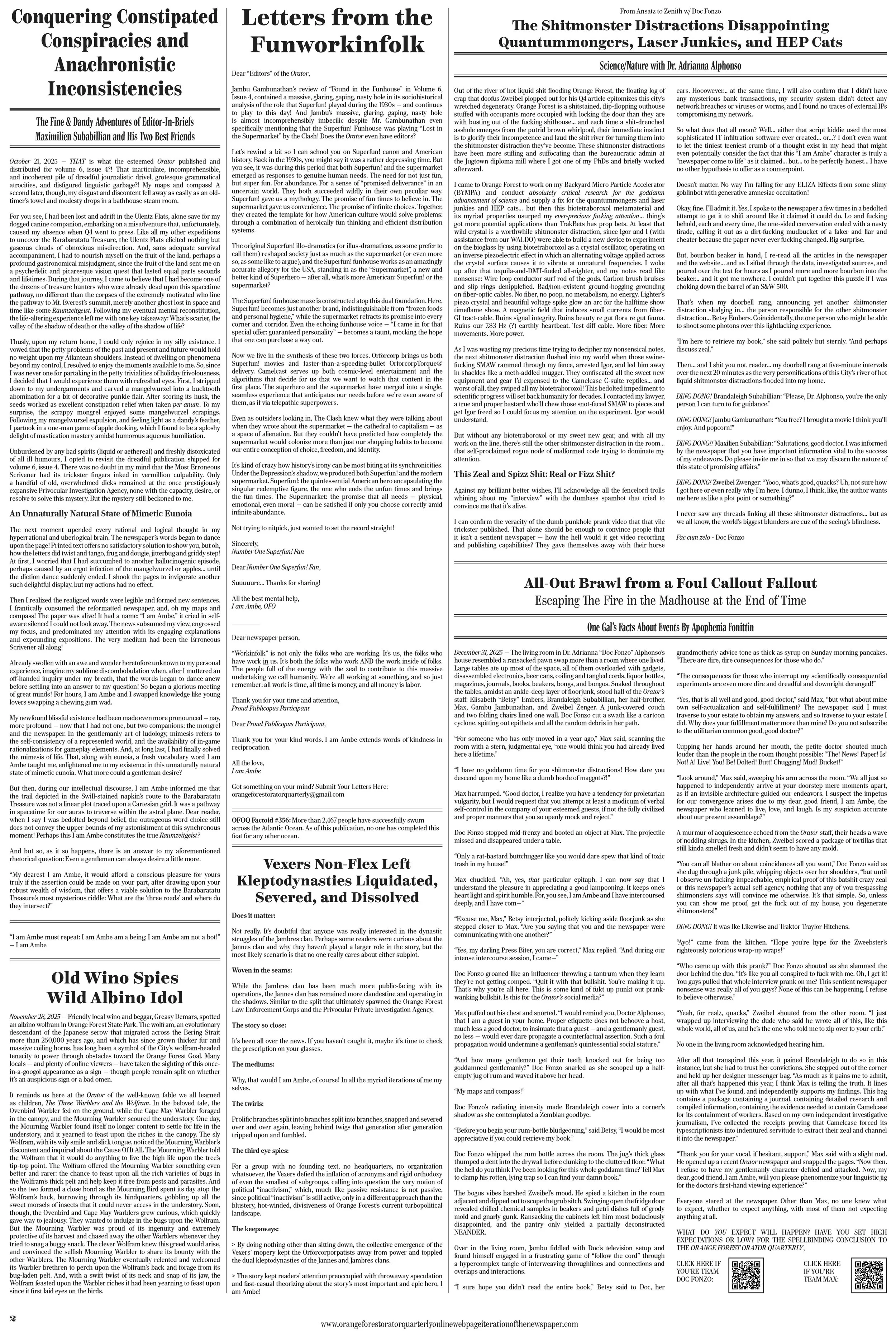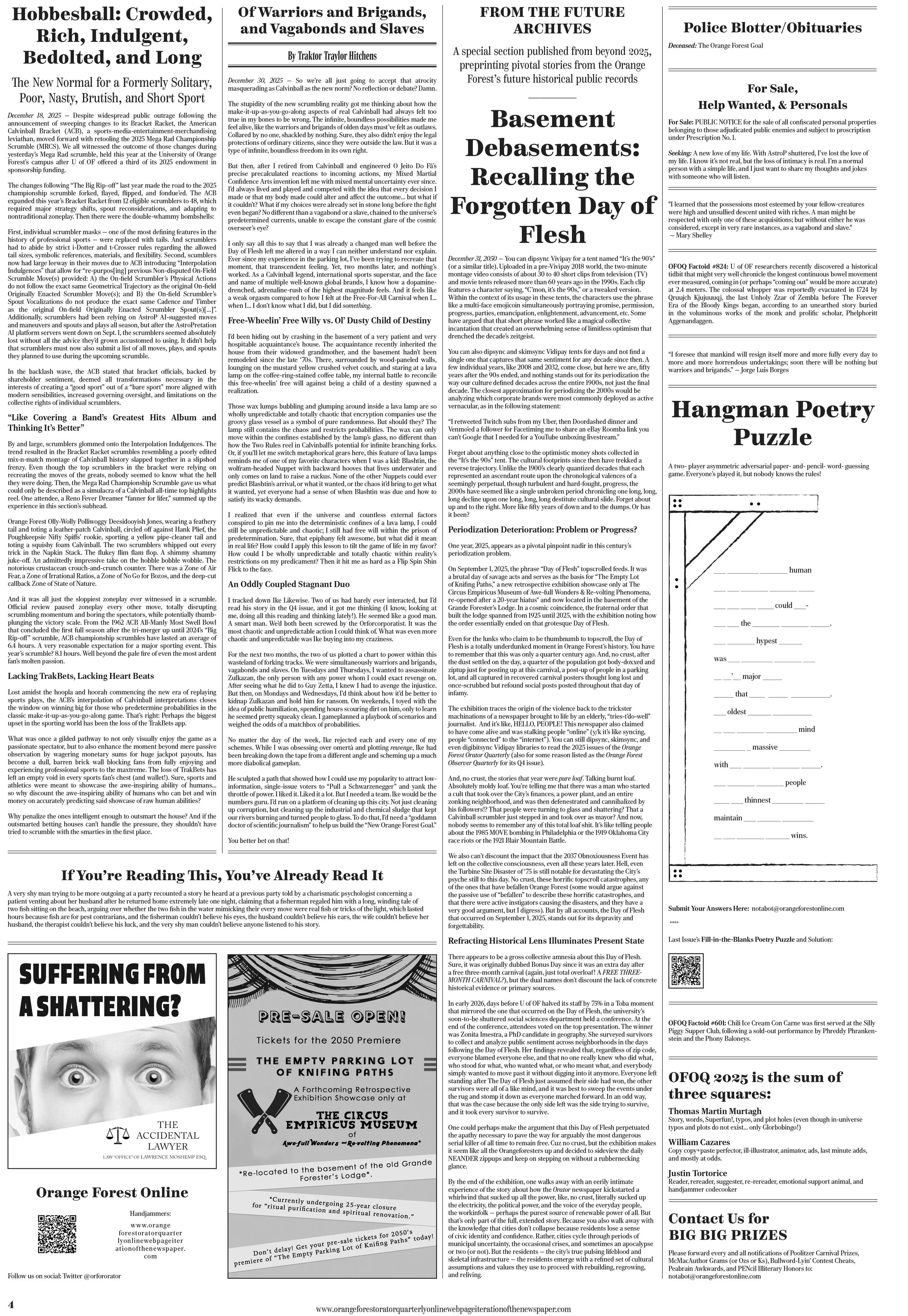 4/6/25 UPDATE: Despite meticulous efforts by diligent Orator staff, the premier private investigation firm Privocular, and heroic Orange Forest Law Enforcement Corps (OFLEC) detectives and enforcers, we are well aware of the inexplicable discrepancy between the contents in the newspaper version and the Orange Forest Online version.